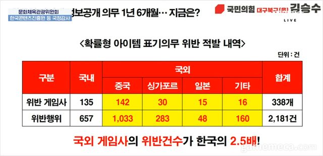 김 의원이 게임위로부터 제출받은 자료에 따르면 법이 시행된 작년 3월 22일부터 올해 9월 22일까지 1년 6개월 간 국내외 게임사 338곳이 확률정보 표시 위반으로 시정요청·권고·명령을 받았다. 이 중 해외는 203곳으로 전체의 60%다. 국적별로 보면 중국 142곳, 싱가포르 30곳, 일본 15곳, 미국 9곳 순이다.