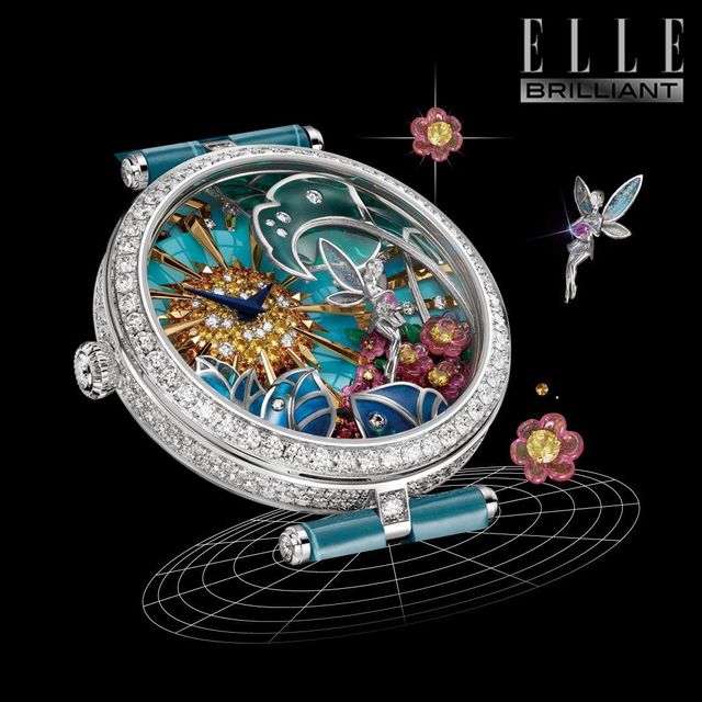 시간 위에 스토리를 녹여내는 메티에 다르 워치의 명가, 반클리프 아펠이 ‘레이디 아펠 데이 앙샹떼’ 워치를 통해 또 하나의 예술 작품을 탄생시켰다. 베젤, 일체형 러그, 미들 케이스 프로파일, 크라운까지 모두 다이아몬드를 파베 세팅해 극강의 화려함을 자랑하며, 입체적인 다이얼을 통해 메종의 예술적 기교를 한껏 드러냈다. 마케트리 기법으로 조립한 튀르쿠아즈 소재 다이얼 위에는 아침 햇살을 받으며 꽃을 따는 우아한 요정이 자리한다. 요정의 날개는 진줏빛 플리크-아-주르 에나멜로 제작해 투명하게 빛나며, 자체 개발한 파소네 에나멜 기법으로 끝없이 펼쳐진 꽃밭의 환영을 만들어냈다. 다이아몬드와 옐로 사파이어, 오렌지 톤의 스페사르타이트 가닛으로 완성한 태양 위에는 블루 핸즈로 시간을 알리고, 태양 광선은 리프트 세팅 기법을 통해 마치 떠 있는 듯한 착시 효과를 연출한다. 푸셔 버튼을 누르면 요정이 꽃을 따는 동작을 감상할 수 있으며, 케이스 뒷면에는 요정이 날아오르는 장면을 정교하게 조각해 한 편의 생동감 넘치는 서사를 완성했다. 예술적 정교함, 혁신적 기술력과 시적인 스토리텔링까지 두루 갖춘 레이디 아펠 데이 앙샹떼 워치는 2024년 GPHG 아티스틱 크래프트 상 수상으로, 메종의 장인 정신과 창의적 비전을 구현한 아트피스 워치임을 다시 한번 입증했다.