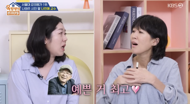 23일 오후 방송한 KBS2 예능 ‘옥탑방의 문제아들’(이하 ‘옥문아’)에는 나태주 시인의 딸이자 19년째 서울대학교에서 글쓰는 법을 가르치고 있는 나민애 교수가 출연했다.