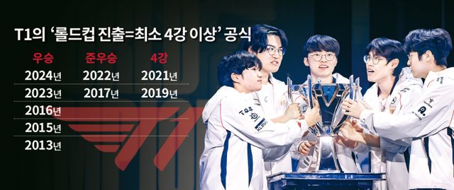 올해로 10번째 롤드컵에 참가한 T1은 4강 이전에 탈락한 적이 없다. 2013년·2015년·2016년·2023년·2024년에는 우승을 차지했고, 2017년과 2022년에는 결승까지 올라갔다가 아쉽게 패배하며 준우승을 기록했다. 2019년과 2021년에는 4강에서 고배를 마셨다.
