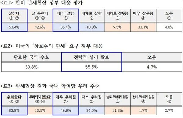이어 "다만 협상 결과에 대해 83.8%라는 압도적 다수가 물가 상승 등 악영향을 불안해하고 있다"며 "정부는 이런 민심을 무겁게 받아들여 협상 결과가 국내 민생 경제에 미칠 충격을 최소화하는 데 총력을 다해야 한다"고 말했다.