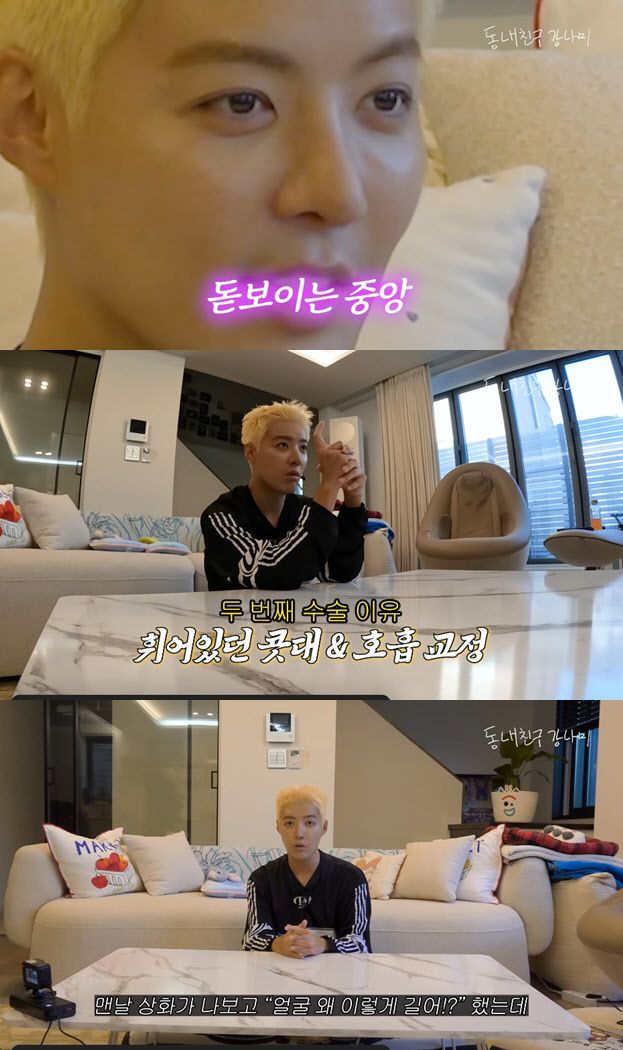 또 강남은 “연골을 이용해서 코 수술을 하면 코가 점점 짧아진다. 어느날 유튜브를 보는데 내 콧구멍만 보이더라”라며 “콧구멍이 보이면 돈이 샌다더라. 그리고 뼈가 휘어있어서 한쪽밖에 숨을 못 쉬었다. 지금은 숨을 잘 쉰다”고 수술 비하인드를 밝혔다.