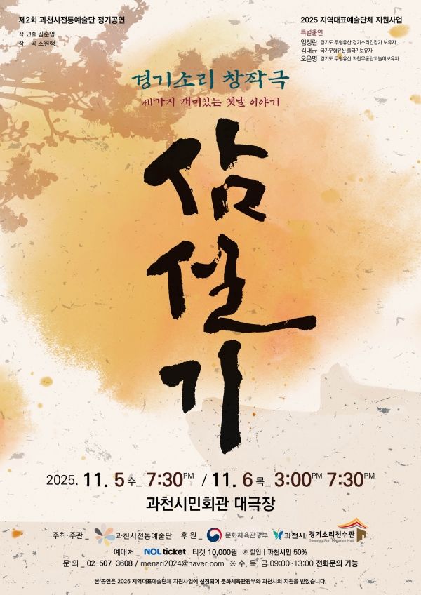 한편, 이번 공연은 과천시전통예술단 주최·주관, 문화체육관광부, 과천시, 경기소리전수관이 후원하며, 관람권은 ‘놀티켓’ 누리집(nol.interpark.com)에서 예매할 수 있다. 전석 1만 원이며, 과천 시민·경로우대자·예술인 패스 소지자·문화누리카드 소지자는 50% 할인 혜택을 받을 수 있다.