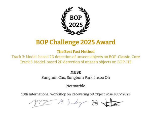 넷마블이 '2025 국제컴퓨터비전학회(ICCV)' 사물 인식 챌린지(BOP Challenge)에서 2개 부문 1위를 차지하며 2관왕을 달성했다고 24일 밝혔다.