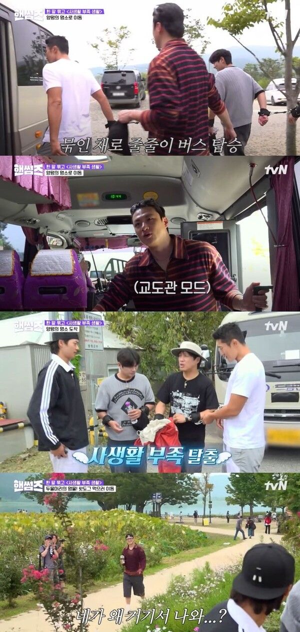 출연진은 손이 모두 묶인 채 한 번에 버스로 이동했다. 오상욱은 "무슨 수감자 같다"고 말했다.