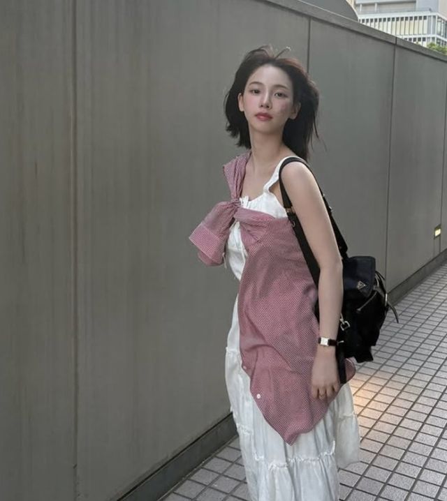 공개된 사진 속 카리나는 화이트 롱 스커트형 원피스 위에 레드 깅엄 체크 패턴의 셔츠를 독특하게 스타일링한 믹스매치 사복 패션을 선보였다.