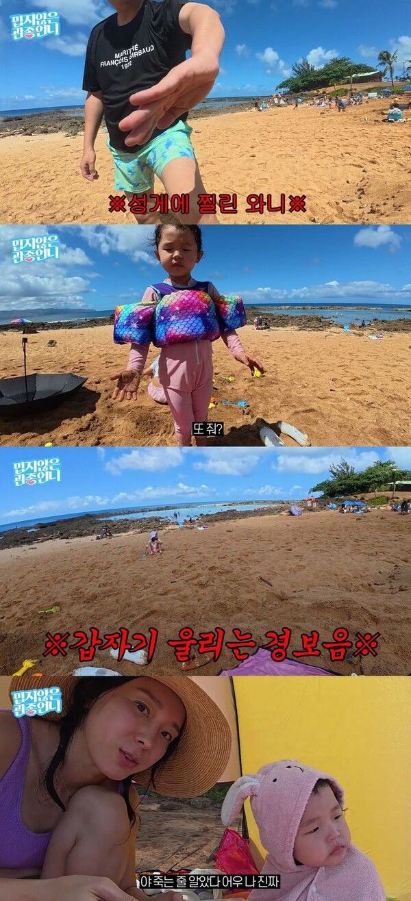 이어 이지혜 남편은 성게에 찔렸다며 손을 보여줬다. 남편은 "엘리 넘어지는 걸 잡아주다가 찔렸다"고 했다.