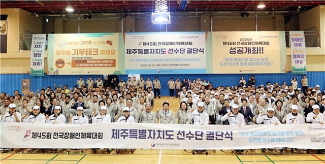 [한라일보] 제45회 전국장애인체육대회에 출전하는 제주특별자치도선수단이 24일 결단식을 갖고 3년 연속 100개 이상의 메달 획득을 목표로 결의를 다졌다.