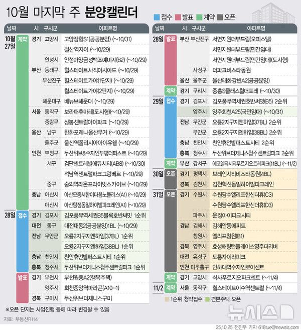 뉴시스 보도에 따르면, 25일 부동산R114에 따르면, 청약 일정은 경기 김포시 사우동 '김포 풍무역세권 B5블록 호반써밋', 충북 청주시 신봉동 '두산위브 더제니스 청주 센트럴파크', 충남 천안시 부대동 '천안 휴먼빌 퍼스트시티' 등에서 진행된다. 견본주택은 경기 파주시 서패동 '운정 아이파크시티', 인천 미추홀구 용현동 '인하대역 수자인로이센트' 등 9곳이 문을 연다.