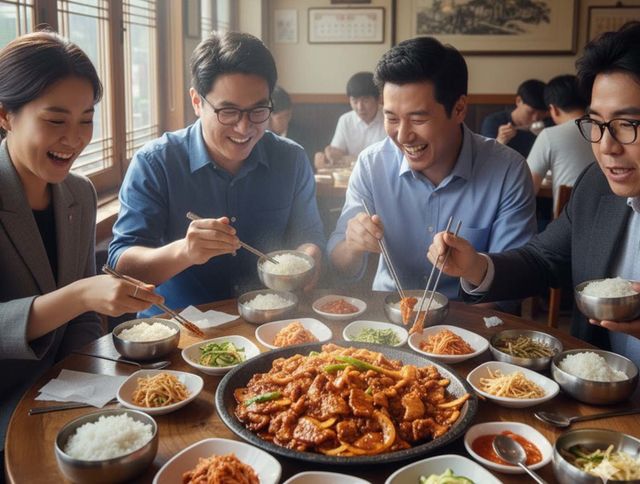 제육볶음을 먹는 직장인들. AI 툴로 제작한 사진이다.
