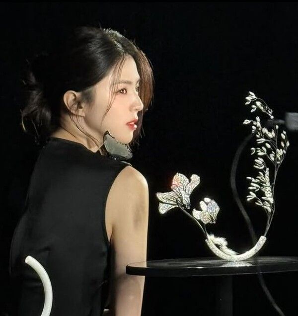 어깨에 얹힌 검은색 나비 장식과 손끝의 흰 깃털 포인트가 어우러지며, 부드럽고 신비로운 분위기를 완성했다.