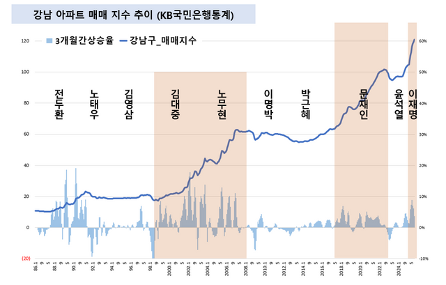 'KB 강남 아파트 매매 지수 추이 그래프'를 보면 1988년 이후 강남 아파트 시장의 장기적인 가격 폭등 추이를 정권별로 정확히 보여주고 있다.