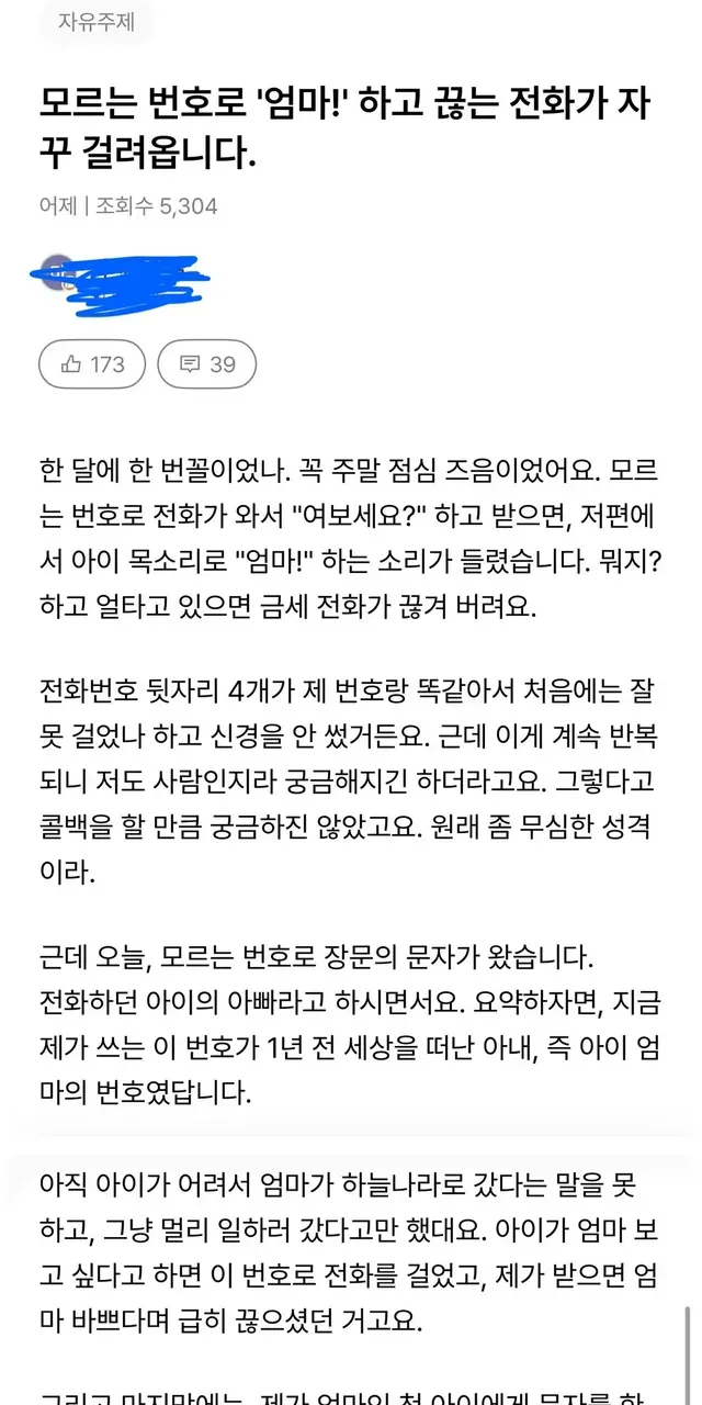 모르는 번호로 ‘엄마!’하고 끊는 전화가 자꾸 걸려온다,,