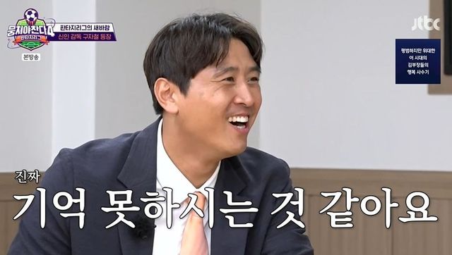 이날 판타지리그에선 이동국, 안정환, 김남일을 긴급 소집했다. MC 김용만이 “박항서 감독이 빠진 빈자리가 큰데, 박항서 감독님을 만나 뵈러 안정환 감독님이 직접 갔다 왔다던데”라고 묻자 안정환은 “누구요? 아, 베트남”이라고 잊은 척해 웃음을 안겼다. 안정환은 “(박항서 감독님이) 미안해하시더라. 일정상 어쩔 수 없이 빠지는 거라 미안하다고 하셨다”라고 전했다.