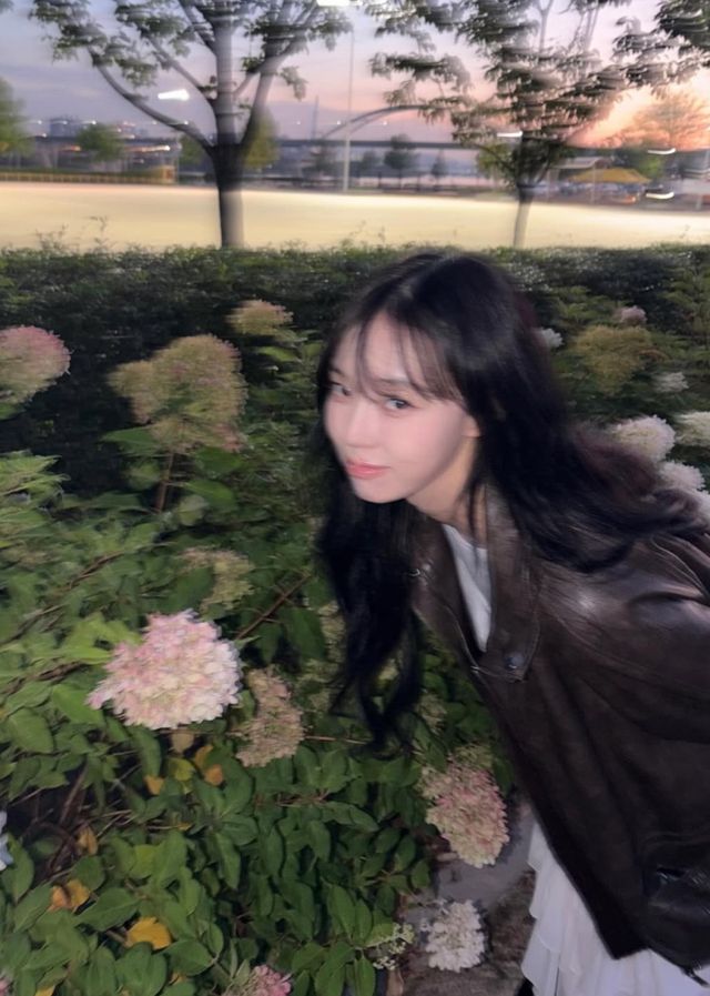 공개된 사진 속 그는 석양과 나무가 어우러진 강가 풍경을 배경으로 앉아 사색에 잠긴 모습. 긴 흑발이 부드럽게 흘러내리며, 어깨를 감싸는 레더 재킷과 화이트 롱스커트의 조합이 청초하면서도 빈티지한 감성을 완성했다.