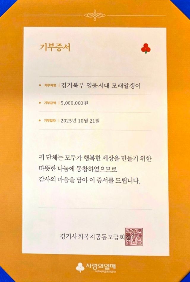 임영웅의 정규 2집 ‘IM HERO 2’ 발매와 전국투어 콘서트 성공을 기원하며, 팬클럽 ‘경기북부 영웅시대 모래알갱이’가 10월 21일 사랑의열매에 500만 원을 기부했다.