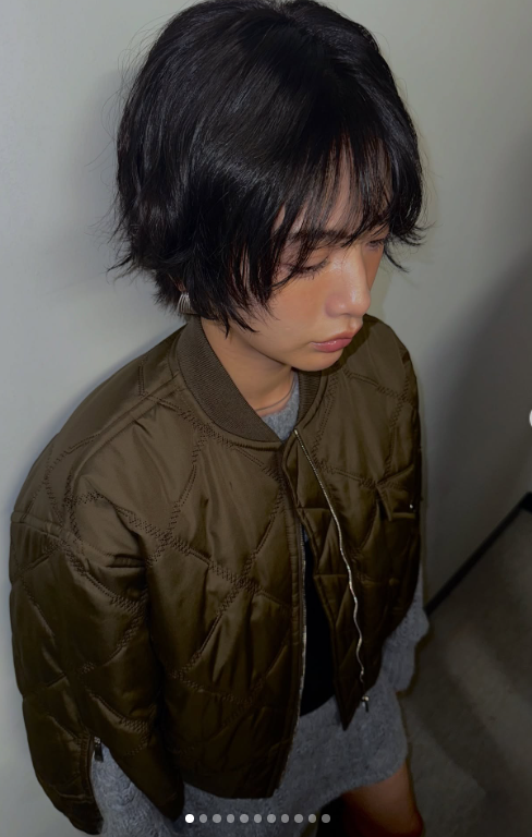 나나난 짧은 흑발 헤어스타일에 카키색 퀼팅 재킷, 그레이 니트 원피스를 매치, 시크하면서도 감각적인 가을 패션을 완성했다.