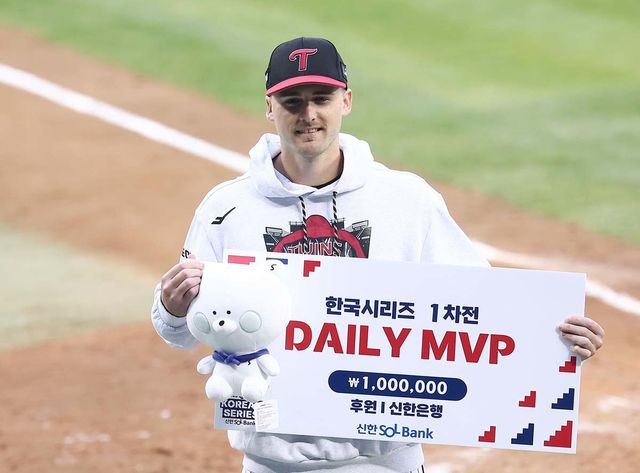 LG 톨허스트가 26일 서울 잠실야구장에서 열린 프로야구 2025 신한 SOL뱅크 KBO 포스트시즌 한국시리즈 1차전 한화 이글스와 LG 트윈스의 경기에서 데일리MVP에 선정된 후 기념촬영을 하고 있다. / 뉴스1