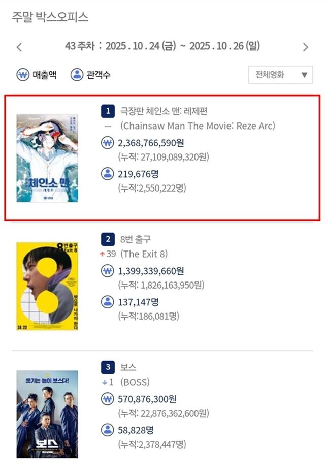 27일 영화관입장권 통합전산망에 따르면, 전날 ‘극장판 체인소 맨: 레제편'(이하 ‘체인소 맨: 레제편’)이 박스오피스 1위를 지키며 장기 흥행을 이어갔다. 누적 관객 수 255만 명을 돌파한 ‘체인소 맨: 레제편’은 올해 521만 관객을 동원한 메가 히트작 ‘F1 더 무비’보다 빠르게 관객 수를 쌓고 있어 이후의 흥행을 더 기대하게 했다.