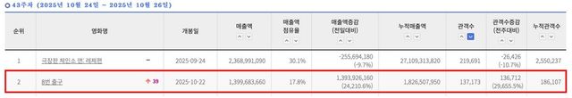 27일 영화관입장권 통합전산망에 따르면, 영화 ‘8번 출구’가 개봉 첫 주말 동 시기 개봉작 박스오피스 1위에 올랐다. 전체 박스오피스에서 2위를 기록 중인 ‘8번 출구’는 1위를 질주 중인 ‘극장판 체인소 맨: 레제편’과 함께 일본 영화 열풍을 이어가고 있다.