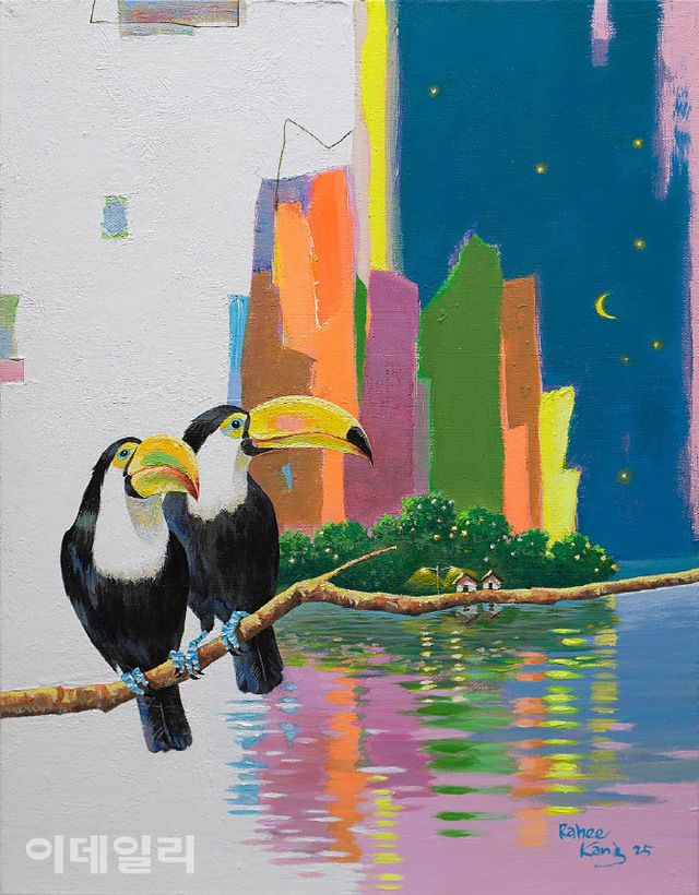 ‘도시 속 고요’(Stillness in the City·2025)는 섬이 돼 도시로 건너온 작가의 새로운 유토피아라고 할까. 검은 털 노란 부리의 새 ‘토코투칸’을 앞세워서. “아마존에 살면서 과일 씨앗을 퍼뜨려 생태계에 기여한다는 토코투칸을 문득 기억해냈다”는데. “누구나 품고 사는 오아시스, 하지만 정작 떠날 순 없는 이들을 위해 내줬다”는 ‘떠나고 싶은’ 섬이다.