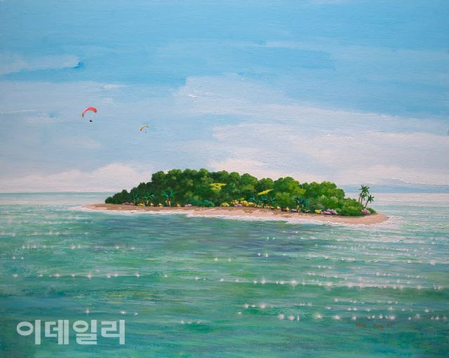 작가 강라희의 붓이, 아니 섬이 도시로 스며들었다. 작가는 그만의 유토피아를 화면에 새겨왔다. 이름 하여 ‘오아시스’. 잔잔한 바다에 피어난 푸른 섬, 그 섬에 오도카니 멈춘 자동차, 그 차를 비추는 달, 그 달을 벗 삼아 나는 행글라이더 등이 오아시스를 충족시켰더랬다.