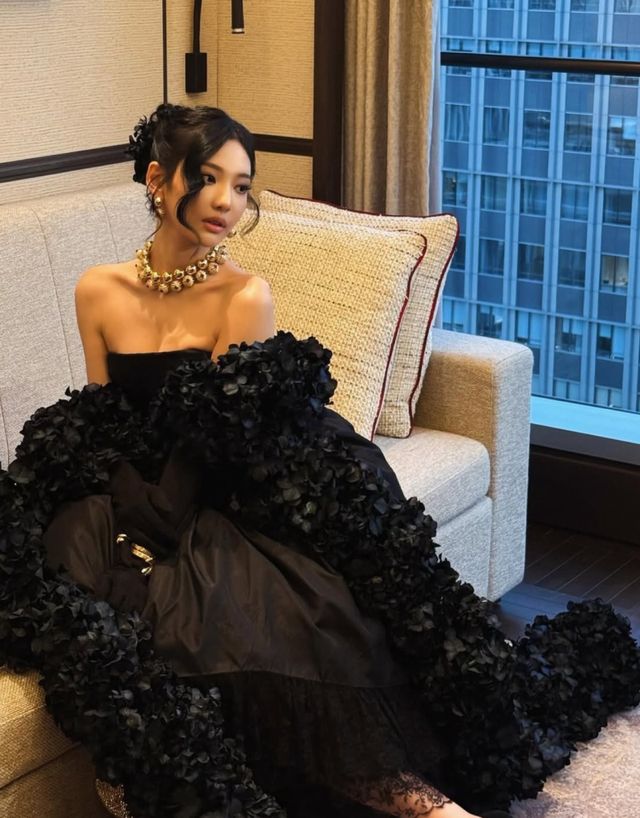 닝닝은 지난 26일 자신의 SNS에 여러 장의 사진을 게재했다. 해당 게시물 속 그는 블랙 톤의 드레스를 착용한 채 호텔 라운지로 보이는 공간에 앉아 있다. 드레스 곳곳을 감싸는 플라워 텍스처 장식과 풍성한 실루엣이 존재감을 극대화한다.