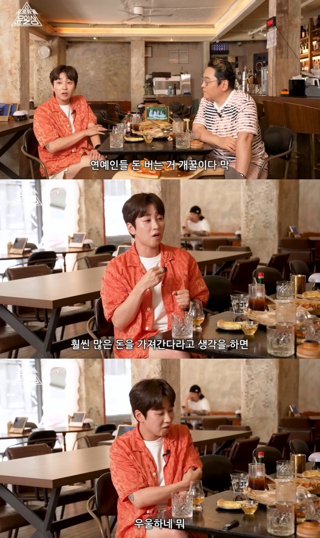 이 가운데 딘딘은 "요즘 드는 생각이 'XX 감사한 인생을 살고 있구나' 싶다"며 "연예인 돈 버는 게 '꿀'이라는 말이 많은데, 큰 돈을 버는 건 맞다. 우리가 21시간 녹화를 하면 제작진도 21시간 녹화를 한다"고 소신 발언을 시작했다.