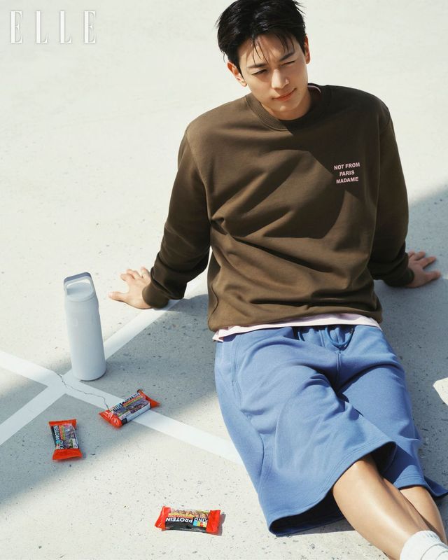 스웨트셔츠는 Drole De Monsieur. 이너 핑크 티셔츠는 Ofcoursewhynot. 버뮤다 스웨트팬츠는 Matin Kim. 삭스는 스타일리스트 소장품.