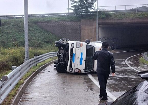 27일 동해지방해양경찰청에 따르면 지난 13일 오후 5시 10분쯤 동해해경청 교육훈련계 조동희 경감과 김호관 경위는 훈련을 위해 이동하던 중 강원 양양군 강현면 북양양 IC 인근 커브 길에서 전도된 1t 트럭을 발견했다.