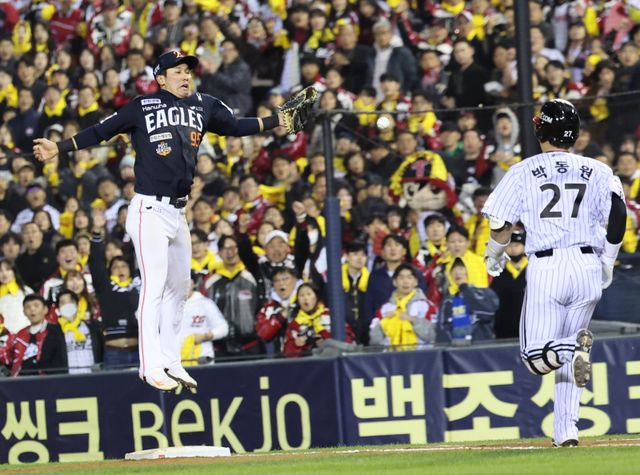 노시환은 26일 1차전에서도 악송구를 했다. 한화가 3-0으로 지고 있었던 5회 말, 문동주가 신민재에게 3루타를 맞고 추가 실점 위기에 놓인 상황에서 오스틴에게 땅볼을 유도했다. 노시환은 포구를 잘 해냈지만, 포수 최재훈이 다이빙 캐치를 해서 잡아야 할만큼 멀리 벗어난 송구를 하고 말았다.