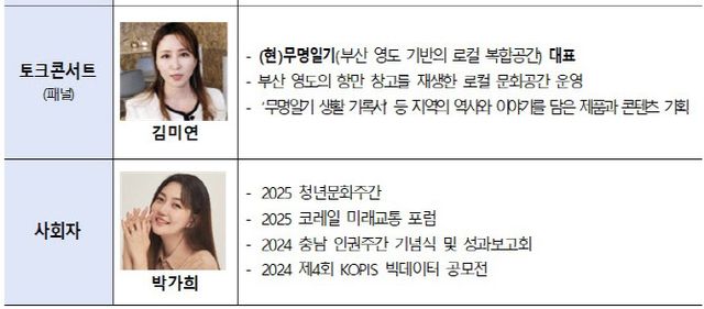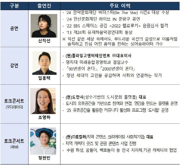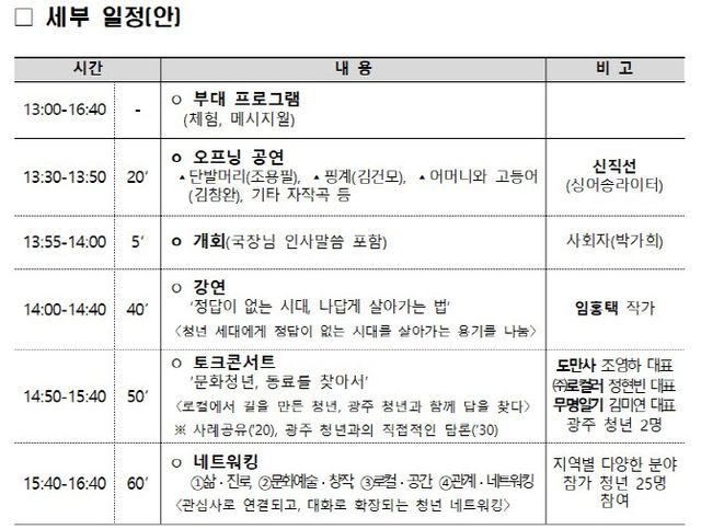 이어 ‘문화청년, 동료를 찾아서’라는 주제로 이야기 콘서트가 열린다. △서울 성수동 지역을 기반으로 도시문화 실험을 이어가고 있는 도시문화플랫폼 도만사 조영하 대표 △부산 영도 지역을 기반으로 한 공간 무명일기 김미연 대표 △지역콘텐츠를 개발하는 사회적기업 ㈜로컬러 정현빈 대표 △광주청년위원회 김승훈 위원장 △광주청년센터 이준영 매니저가 토론자로 나서, 서로 다른 지역 각자의 자리에서 문화를 통해 관계를 만들고, 새로운 길을 개척한 경험과 생각을 나눈다.