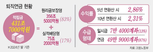 노사정이 기금형 퇴직연금 도입 추진에 나선 것은 현행 퇴직연금 제도 하에선 ‘근로자의 노후소득 보장 기능’을 다하기 어렵다는 데 공감했기 때문이다. 적립금이 지난해 말 432조원까지 불어났지만 여전히 82.5%는 대기성 자금을 포함한 원리금보장형에 몰려 있는 탓이다. 수십년을 적립해도 물가상승을 반영한 자산 가치는 제자리여서 연금보다 일시금으로 수령하는 비중이 87.0%에 달한다.