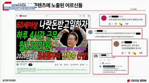 이에 대해 임을기 보건복지부 노인정책관은 “노인일자리와 복지제도 등 정부정책을 악용한 허위콘텐츠 확산문제를 인지하고 있다”며 “유관기관과 논의해 대응방안을 마련하고 의원실에 보고하겠다”고 답했다.