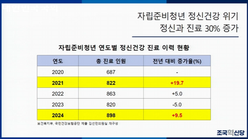 김선민 의원실이 2024년 12월 기준 자립준비청년 8501명을 대상으로 지난 5년간 정신건강 진료이력을 추적한 결과, 2020년 687명이던 진료이용자는 2024년 898명으로 약 30.7% 증가했다. 질환별로는 647명이 정동장애를 겪었으며 조현병 등 중증질환을 앓는 청년도 71명에 달했다.