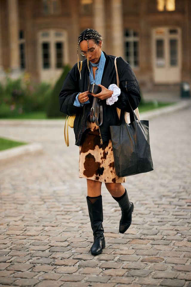 애니멀 프린트 스커트는 레이어링이 필수인 가을 스타일링에서 다양한 믹스 매치를 가능하게 해주는데요. 하나하나 떼어 놓고 보면 절대 어울릴 것 같지 않은 블루 스트라이프 셔츠, 넉넉한 봄버 재킷, 니 하이 부츠를 런웨이 룩처럼 센스 있게 연출했습니다. 프린트, 소재, 텍스처 모두 제각각이지만 한 겹 한 겹 더해지며 풍성한 스타일을 연출했죠.
