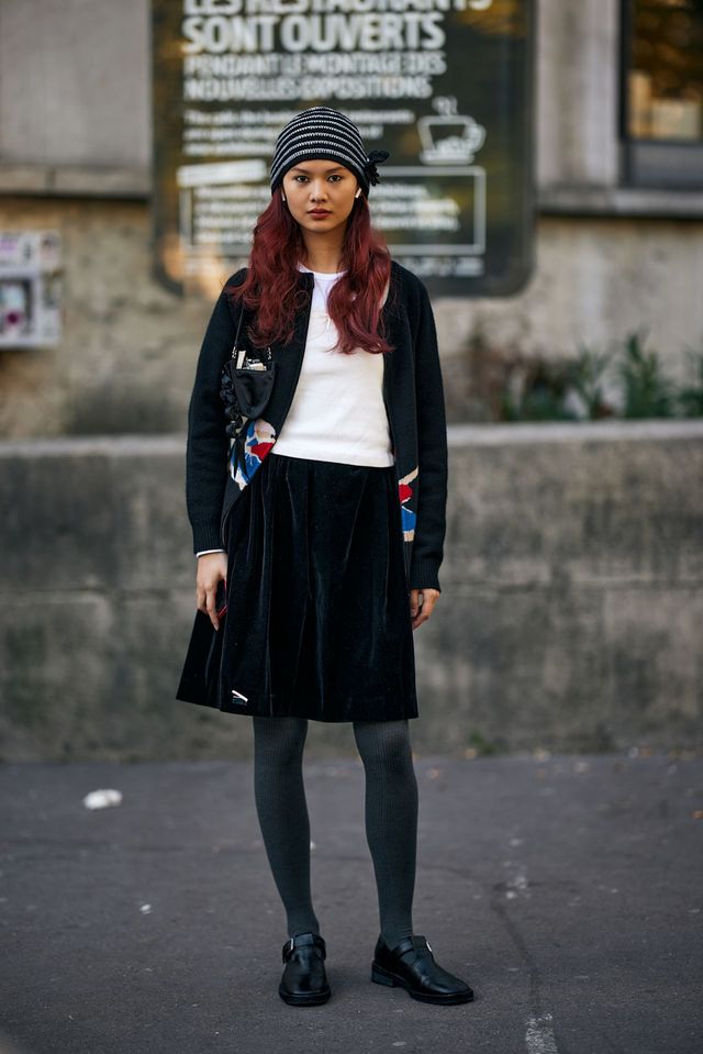 살짝 번들거리는 벨벳 텍스처가 가을 햇살 아래에서 빛을 발합니다. 흰 티셔츠와 블랙 카디건이라는 빈티지한 조합에 두꺼운 타이츠와 T 스트랩 더비 슈즈로 균형을 찾았어요. 학생 같은 무드를 풍기면서도 자유롭게 개성을 드러낸 점이 돋보이죠. 자칫 무겁고 부담스럽게 느껴지는 벨벳 스커트도 이렇게 어려 보일 수 있다고 외치는 듯 합니다.