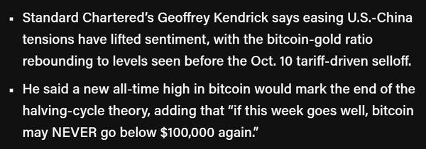 영국계 은행사인 스탠다드차타드(Standard Chartered) 분석진은 10월 마지막 주 보고서를 통해 미국과 중국 무역 협상 진전과 위험자산 회복세가 맞물리며 비트코인 가격이 다시는 10만 달러(한화 약 1억 4,333만 원) 아래로 떨어질 가능성이 높아졌다고 밝혔다.