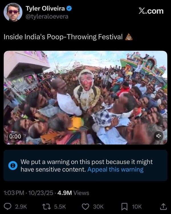 뉴시스 보도에 따르면, 23일(현지시각) 미국인 유튜버 타일러 올리베이라는 소셜미디어 엑스(X·전 트위터)에 '인도의 똥 던지기 축제에서(Inside India's Poop-Throwing Festival)'라는 제목의 글과 영상을 게시했다.