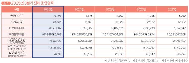 예술경영지원센터가 29일 발표한 ‘2025년 3분기 공연시장 티켓판매현황분석보고서’에 따르면, 올해 7~9월 공연예술통합전산망(KOPIS) 기준 티켓판매액은 4615억 원, 예매 수는 653만 매로 집계됐다. 지난해 같은 기간과 비교해 예매 수는 74만 매(12.8%) 증가했고, 판매액은 768억 원(20%) 늘었다. 티켓 1매당 평균 판매액은 약 7만1000원으로, 전년 대비 약 4000원 상승했다.