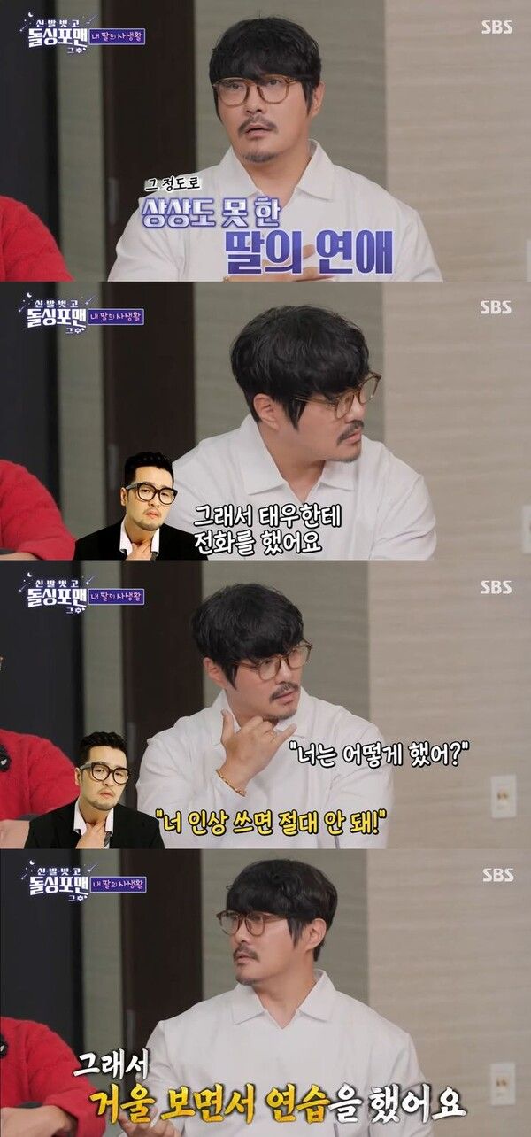 그는 "가수 김태우 딸과 첫째가 동갑이라 전화해서 물어봤는데 되게 쿨하더라"며 "절대 인상 쓰지 말라고 했다. '우리 딸 남자친구 생겼어. 너무 축하해' 이렇게 말하라 했다"고 했다.