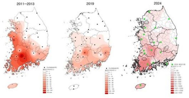 쯔쯔가무시증의 주요 매개종인 활순털진드기의 분포지역 확대. 남부지역에 주로 분포하던 활순털진드기가 점차 북상하는 경향을 보이고 있다. / 질병관리청 제공