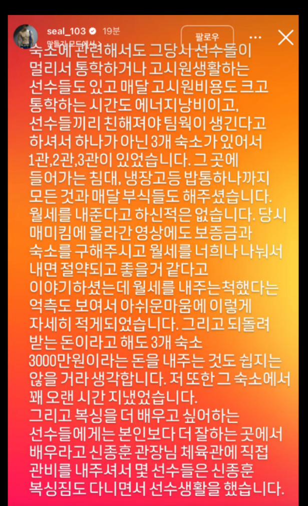숙소에 관해서도 그 당시 선수들이 멀리서 통학하거나 고시원 생활하는 선수들도 있고 매달 고시원 비용도 크고 통학하는 시간도 에너지 낭비이고, 선수들끼리 친해져야 팀워크가 생긴다고 하셔서 하나가 아닌 3개 숙소가 있어서 1관, 2관, 3관이 있었습니다. 그 곳에 들어가는 침대, 냉장고 등 밥통 하나까지 모든 것과 매달 부식들도 해주셨습니다. 월세를 내준다고 하신 적은 없습니다. 당시 매미킴에 올라간 영상에도 보증금과 숙소를 구해주시고 월세를 너희가 나눠서 내면 절약되고 좋을 것 같다고 이야기하셨는데 월세를 내주는 척했다는 억측도 보여서 아쉬운 마음에 이렇게 자세히 적게 되었습니다. 그리고 되돌려 받는 돈이라고 해도 3개 숙소 3000만원이라는 돈을 내주는 것도 쉽지는 않을 거라 생각합니다. 저 또한 그 숙소에서 꽤 오랜 시간 지냈었습니다.