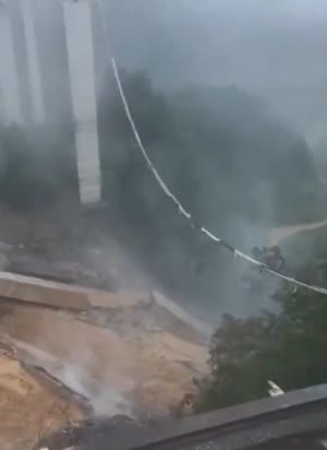 폭우로 다리가 끊어져 가장자리에 매달린 중국 트럭커