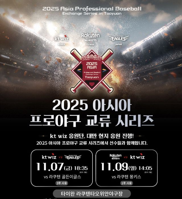 KT위즈를 비롯해 대만 라쿠텐 몽키스, 일본 도호쿠 라쿠텐 골든이글스 등 세 팀이 참가하며, 라쿠텐 타오위안 야구장에서 친선 경기를 가질 예정이다. KT는 7일 라쿠텐 골든이글스, 9일 라쿠텐 몽키스와 각각 경기를 치른다. 일본 와카야마 마무리 캠프에 참가 중인 선수단이 교류전에 참가해 경험을 쌓는다.