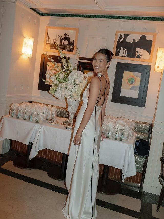 클래식하고 우아한 스타일의 웨딩드레스로 본식을 마무리한 정다혜는 애프터 파티를 통해 좀 더 자유롭고 쿨한 무드의 이브닝 드레스로 갈아입었다. 깊이 파인 브이넥의 화이트 드레스에 블랙 스트랩이 포인트로 도드라진 이브닝 드레스는 빅토리아 베컴으로, 젊은 신부의 생기 넘치는 모습을 보여주기에 적절한 선택이 되었다.