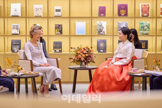 이에 다이애나 카니 여사는 “한국을 꼭 와보고 싶었는데 이번 APEC 계기로 방한하게 되어 매우 기쁘다”며 한복을 입은 김 여사에게 “전통의상이 잘 어울리고 참 아름답다”고 말했다.