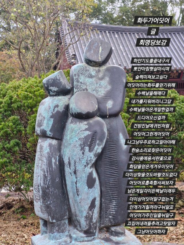 하얀기도를끝내구서 뽀얀아침햇살마시며 슬쩍미쳐보고싶다 어딧어라는화두를얻기위해 수백날을해매다 내가를지워버리니그답 수백날돌아온게잘한걸까 드디어오신걸까 어딧어그런게어딧어 나그냥우주로하고말아야해 한숨소리로찾은어딧어 감사품에용서란꽃으로 화답을얻은게겨우이딧어 더이상찾을것도바랄것도없다 어딧어로흡족함서써보자 남은게일각이든백날이래두 더이상어딧어말구없는겨 안개가거칠꺼라구뉘알꼬 어딧어가주인일줄뉘알구 끄집어내려들추려고탓말자 그냥어딧어하자