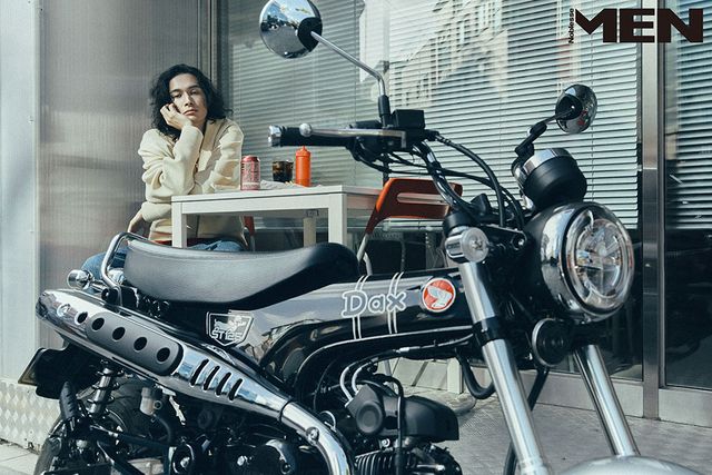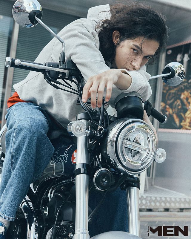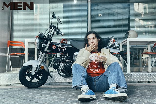 그레이 후드 티셔츠, 레드 티셔츠 모두 Drôle de Monsieur, 라이트 데님 팬츠 Levi’s, 신발 Converse.