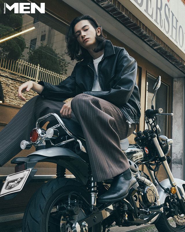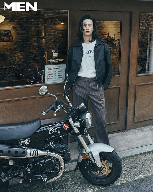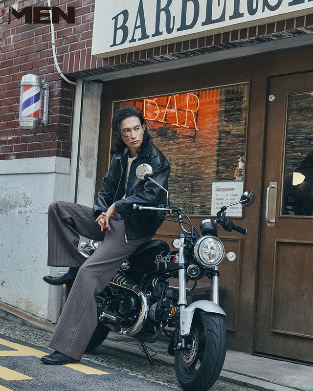 레터링 화이트 티셔츠, 브라운 스트라이프 팬츠 Recto. 블랙 레더 재킷, 첼시 부츠 에디터 소장품.
